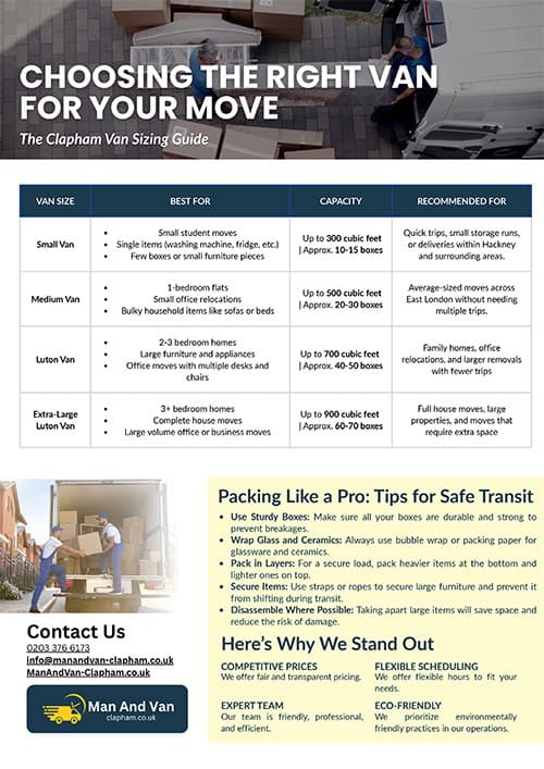 If you’re unsure which van size best suits your move, our expert team at Man and Van Islington is ready to help. We provide tailored advice to ensure you select the most practical vehicle for your move, helping you avoid unnecessary hassle on moving day.